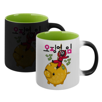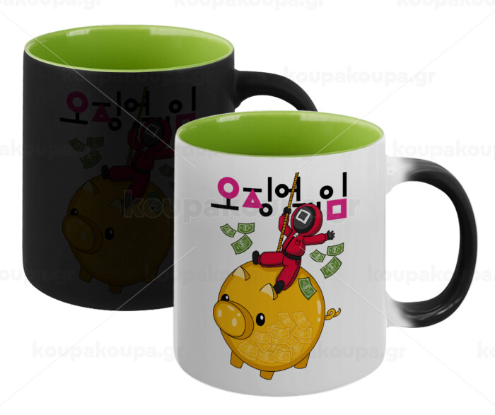 Squid game money pig, Κούπα Μαγική εσωτερικό πράσινο, κεραμική 330ml που αλλάζει χρώμα με το ζεστό ρόφημα