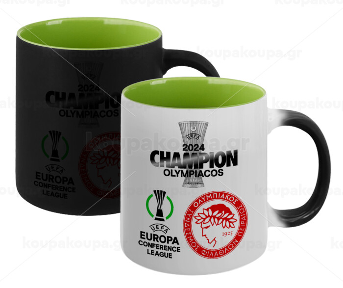 Olympiacos UEFA Europa Conference League Champion 2024, Κούπα Μαγική εσωτερικό πράσινο, κεραμική 330ml που αλλάζει χρώμα με το ζεστό ρόφημα
