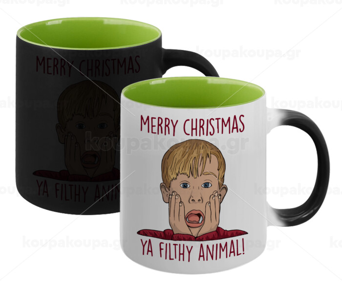 home alone, Merry Christmas ya filthy animal, Κούπα Μαγική εσωτερικό πράσινο, κεραμική 330ml που αλλάζει χρώμα με το ζεστό ρόφημα