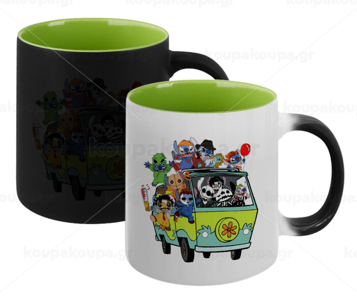 Stitch Halloween scooby car, Κούπα Μαγική εσωτερικό πράσινο, κεραμική 330ml που αλλάζει χρώμα με το ζεστό ρόφημα