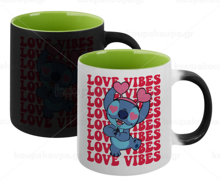 Lilo & Stitch Love vibes, Κούπα Μαγική εσωτερικό πράσινο, κεραμική 330ml που αλλάζει χρώμα με το ζεστό ρόφημα