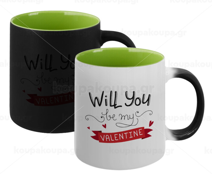 Will you be my Valentine???, Κούπα Μαγική εσωτερικό πράσινο, κεραμική 330ml που αλλάζει χρώμα με το ζεστό ρόφημα