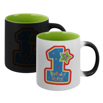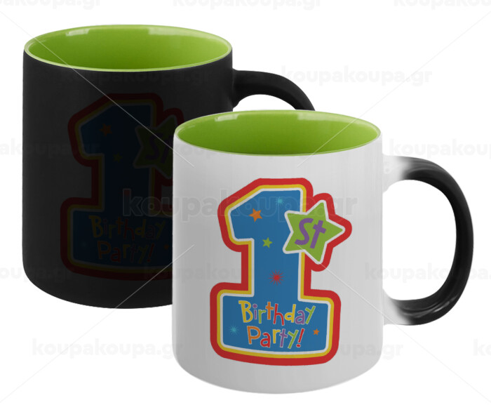 Happy 1st Birthday, Κούπα Μαγική εσωτερικό πράσινο, κεραμική 330ml που αλλάζει χρώμα με το ζεστό ρόφημα