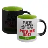 Κούπα μαύρη μαγική ΜΑΤ εξαιρετικής ποιότητας. Με καφέ, τσάι, νερό ή οποιοδήποτε υγρό από 50 βαθμούς και άνω η κούπα αρχίζει να εμφανίζει το σχέδιο έκπληξη. Μόλις το υγρό πέφτει κάτω από τους 50 βαθμούς και αρχίζει να κρυώνει, ξαναγίνεται μαύρη.