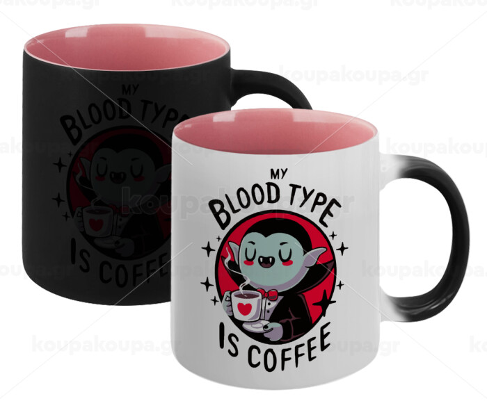 My blood type is coffee, Κούπα Μαγική εσωτερικό ΡΟΖ, κεραμική 330ml που αλλάζει χρώμα με το ζεστό ρόφημα