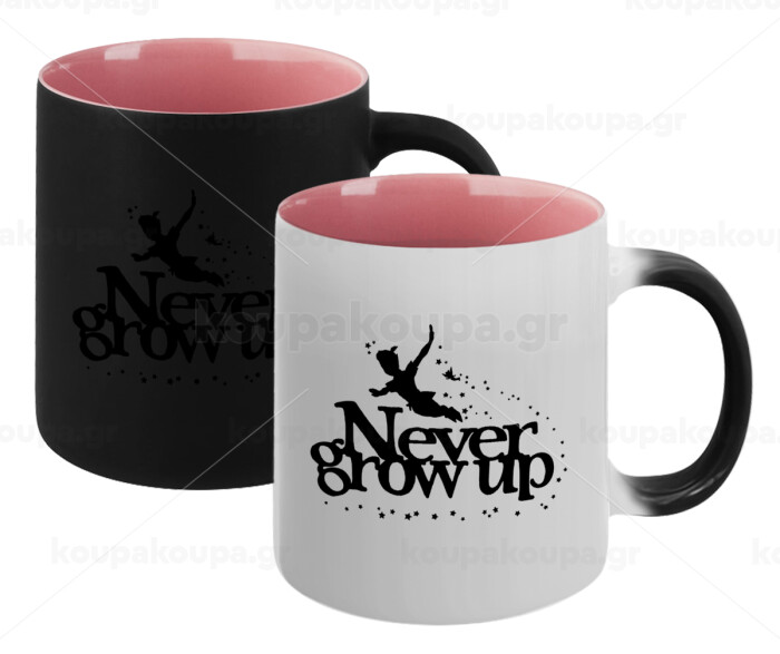 Peter pan, Never Grow UP, Κούπα Μαγική εσωτερικό ΡΟΖ, κεραμική 330ml που αλλάζει χρώμα με το ζεστό ρόφημα