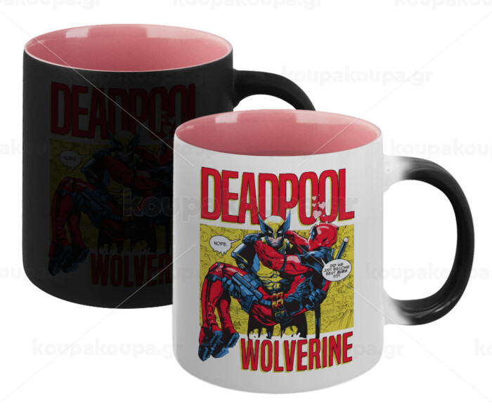 Superhero Deadpool Wolverine, Κούπα Μαγική εσωτερικό ΡΟΖ, κεραμική 330ml που αλλάζει χρώμα με το ζεστό ρόφημα