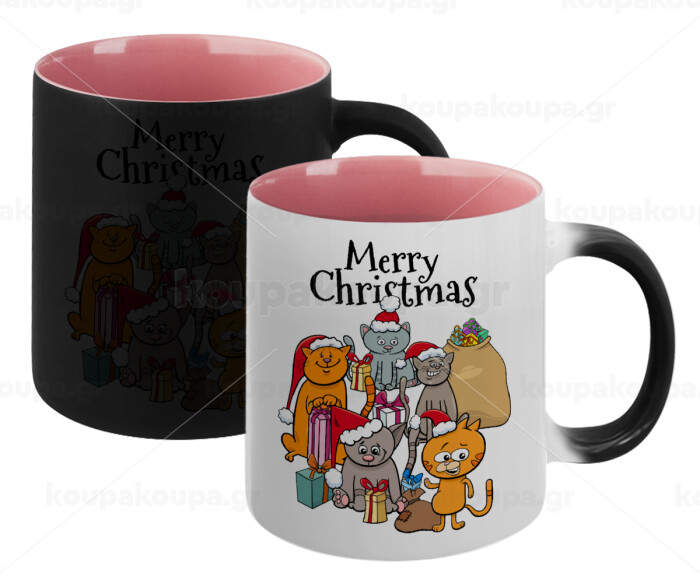 Merry Christmas Cats, Κούπα Μαγική εσωτερικό ΡΟΖ, κεραμική 330ml που αλλάζει χρώμα με το ζεστό ρόφημα