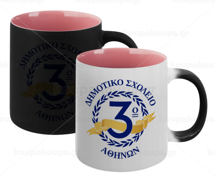 Έμβλημα Σχολικό μπλε, Κούπα Μαγική εσωτερικό ΡΟΖ, κεραμική 330ml που αλλάζει χρώμα με το ζεστό ρόφημα