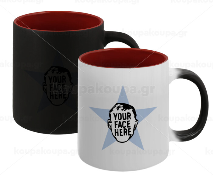 Κούπα μαύρη μαγική ΜΑΤ εξαιρετικής ποιότητας. Με καφέ, τσάι, νερό ή οποιοδήποτε υγρό από 50 βαθμούς και άνω η κούπα αρχίζει να εμφανίζει το σχέδιο έκπληξη. Μόλις το υγρό πέφτει κάτω από τους 50 βαθμούς και αρχίζει να κρυώνει, ξαναγίνεται μαύρη.