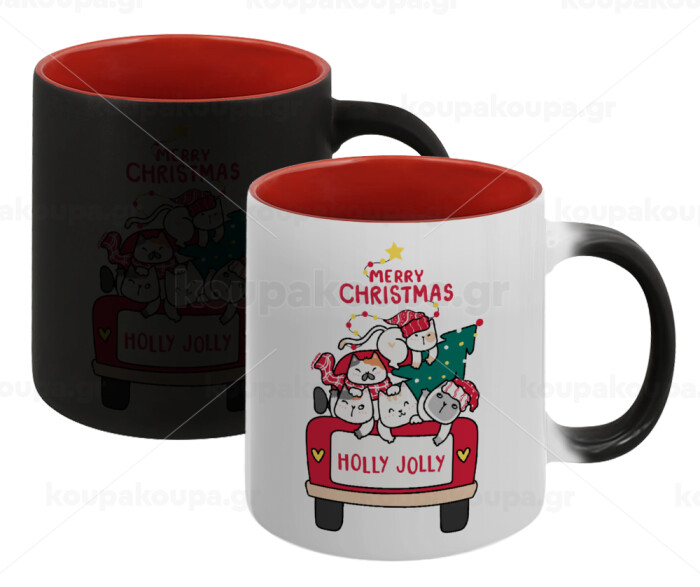 Merry Christmas cats in car, Κούπα Μαγική εσωτερικό κόκκινο, κεραμική, 330ml που αλλάζει χρώμα με το ζεστό ρόφημα