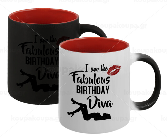 I am the fabulous Birthday Diva, Κούπα Μαγική εσωτερικό κόκκινο, κεραμική, 330ml που αλλάζει χρώμα με το ζεστό ρόφημα