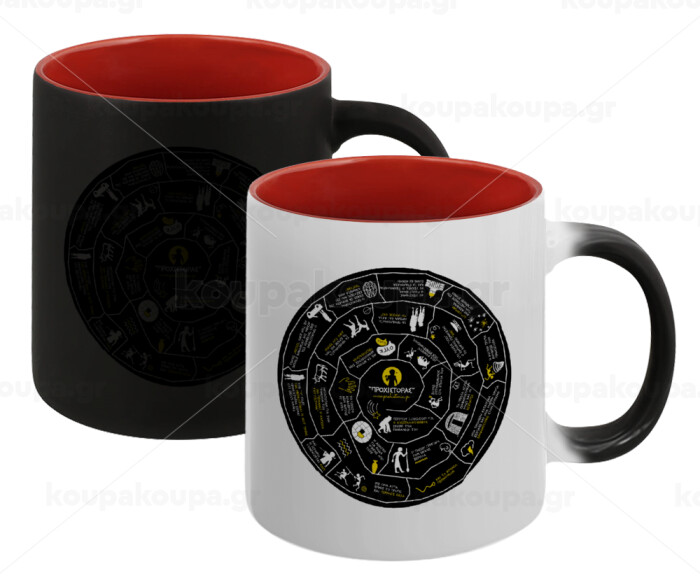 Κούπα μαύρη μαγική ΜΑΤ εξαιρετικής ποιότητας. Με καφέ, τσάι, νερό ή οποιοδήποτε υγρό από 50 βαθμούς και άνω η κούπα αρχίζει να εμφανίζει το σχέδιο έκπληξη. Μόλις το υγρό πέφτει κάτω από τους 50 βαθμούς και αρχίζει να κρυώνει, ξαναγίνεται μαύρη.