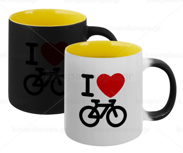 I love Bike, Κούπα Μαγική εσωτερικό κίτρινη, κεραμική 330ml που αλλάζει χρώμα με το ζεστό ρόφημα