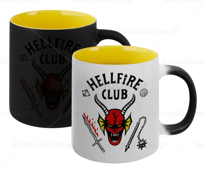 Hellfire CLub, Stranger Things, Κούπα Μαγική εσωτερικό κίτρινη, κεραμική 330ml που αλλάζει χρώμα με το ζεστό ρόφημα