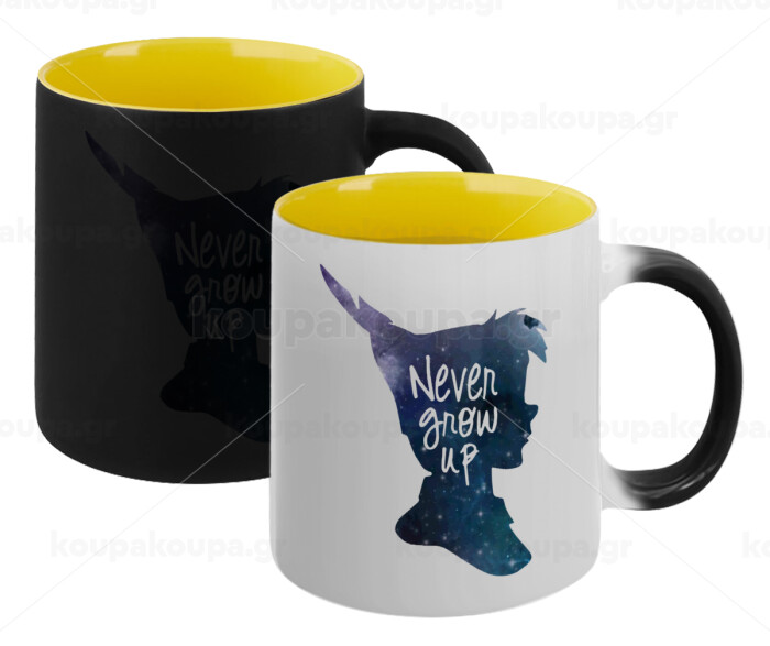 Never Grow UP, Κούπα Μαγική εσωτερικό κίτρινη, κεραμική 330ml που αλλάζει χρώμα με το ζεστό ρόφημα