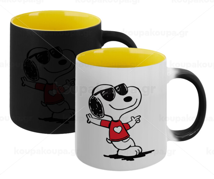 Snoopy καρδούλα, Κούπα Μαγική εσωτερικό κίτρινη, κεραμική 330ml που αλλάζει χρώμα με το ζεστό ρόφημα