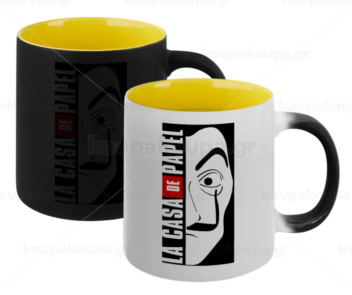 La casa de papel vertical, Κούπα Μαγική εσωτερικό κίτρινη, κεραμική 330ml που αλλάζει χρώμα με το ζεστό ρόφημα