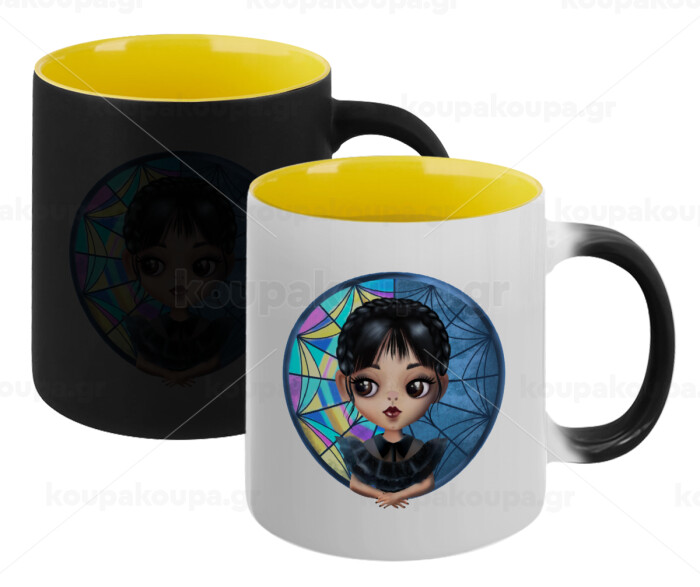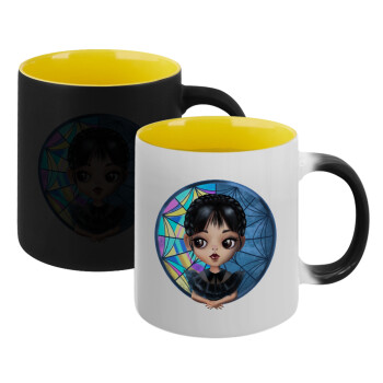 Wednesday big eyes, Κούπα Μαγική εσωτερικό κίτρινη, κεραμική 330ml που αλλάζει χρώμα με το ζεστό ρόφημα