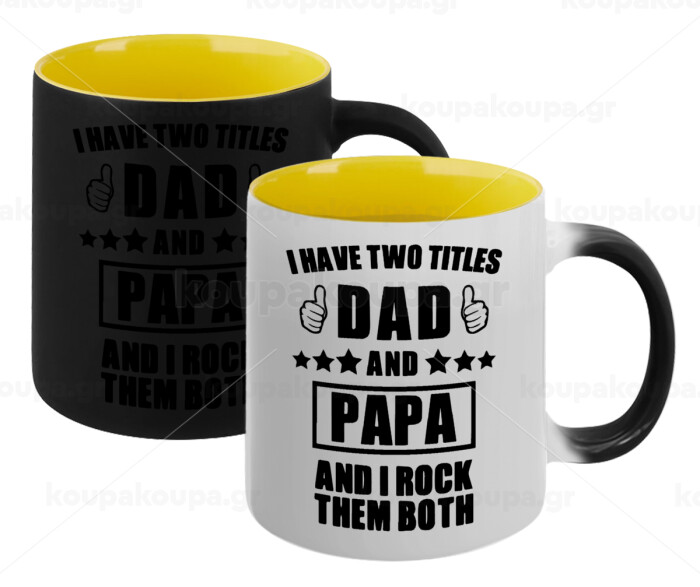 I have two title, DAD & PAPA, Κούπα Μαγική εσωτερικό κίτρινη, κεραμική 330ml που αλλάζει χρώμα με το ζεστό ρόφημα