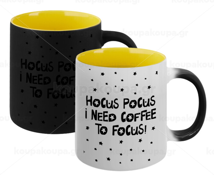 Hocus pocus i need coffee to focus - halloween, Κούπα Μαγική εσωτερικό κίτρινη, κεραμική 330ml που αλλάζει χρώμα με το ζεστό ρόφημα