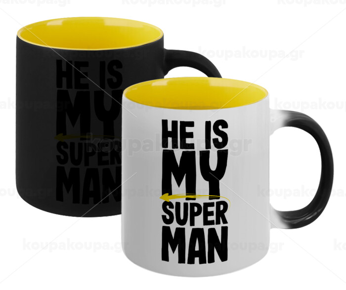 He is my superman, Κούπα Μαγική εσωτερικό κίτρινη, κεραμική 330ml που αλλάζει χρώμα με το ζεστό ρόφημα