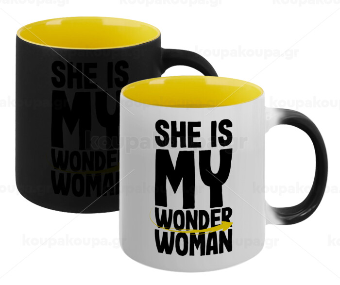 She is my wonder woman, Κούπα Μαγική εσωτερικό κίτρινη, κεραμική 330ml που αλλάζει χρώμα με το ζεστό ρόφημα