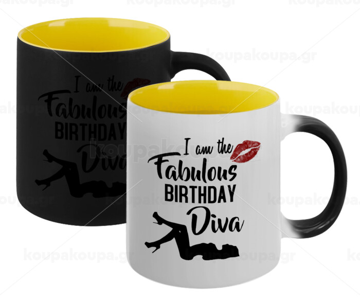 I am the fabulous Birthday Diva, Κούπα Μαγική εσωτερικό κίτρινη, κεραμική 330ml που αλλάζει χρώμα με το ζεστό ρόφημα