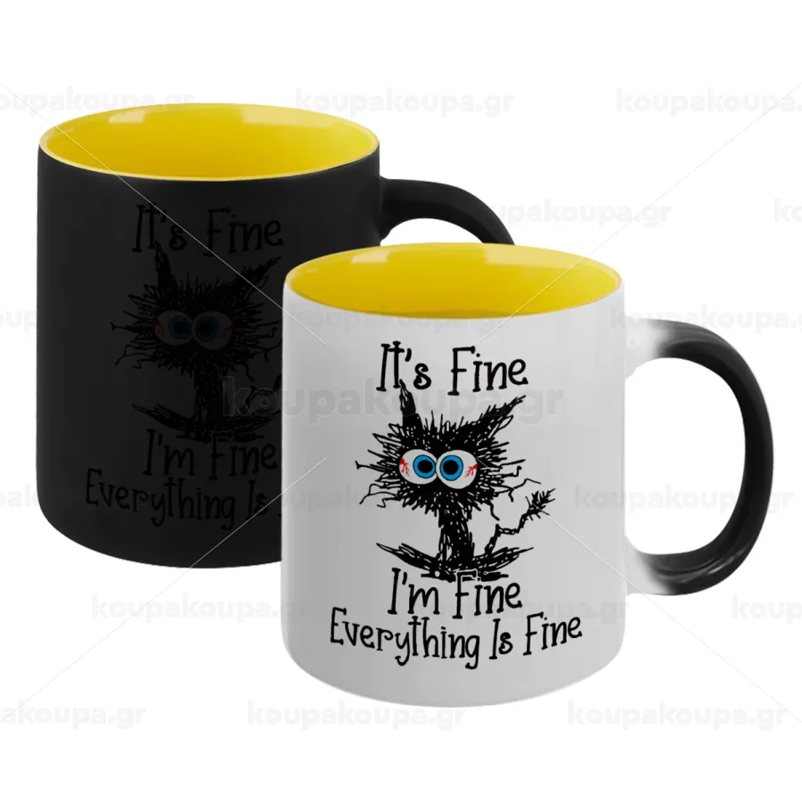 Cat, It's Fine I'm Fine Everything Is Fine, Κούπα Μαγική εσωτερικό κίτρινη, κεραμική 330ml που αλλάζει χρώμα με το ζεστό ρόφημα
