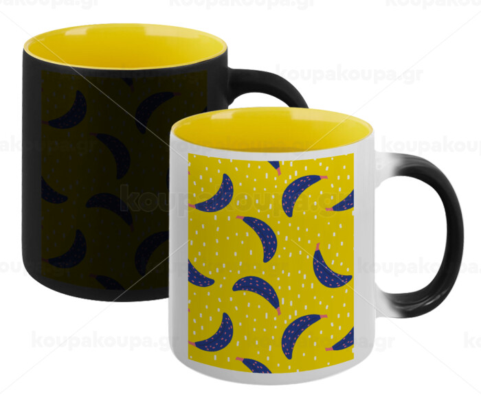 Yellow seamless with blue bananas, Κούπα Μαγική εσωτερικό κίτρινη, κεραμική 330ml που αλλάζει χρώμα με το ζεστό ρόφημα