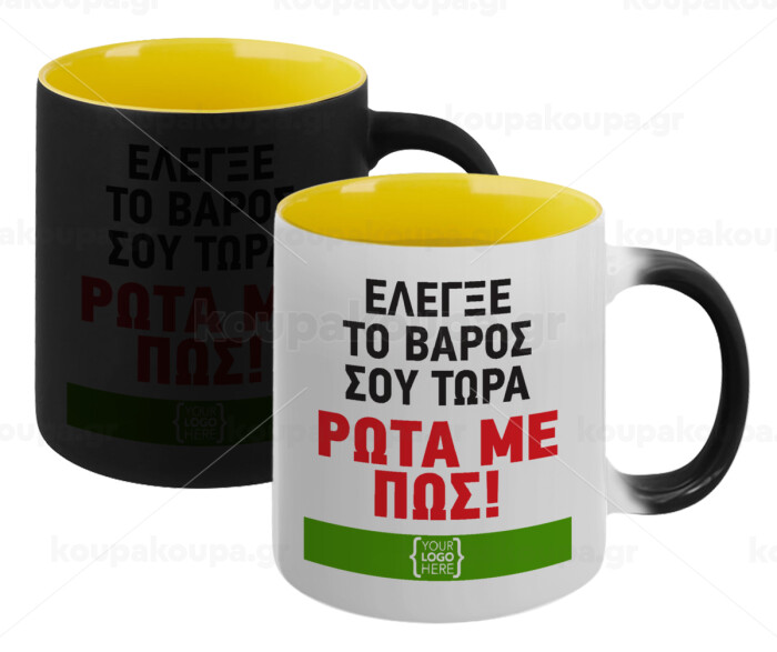 Έλεγξε το βάρος σου ρώτα με πως! {your logo here}, Κούπα Μαγική εσωτερικό κίτρινη, κεραμική 330ml που αλλάζει χρώμα με το ζεστό ρόφημα