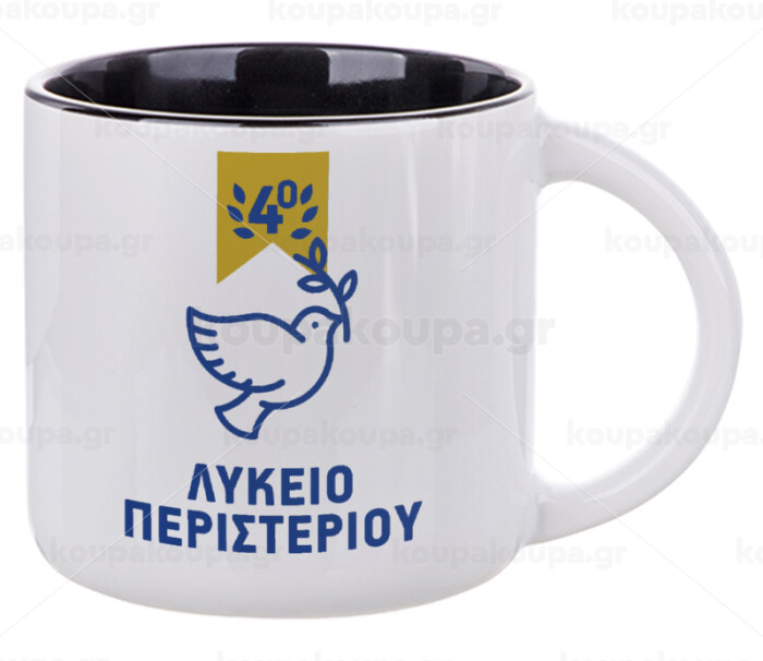 Έμβλημα Σχολικό μπλε/χρυσό περιστέρι, Κούπα κεραμική 400ml Λευκή/Μαύρη