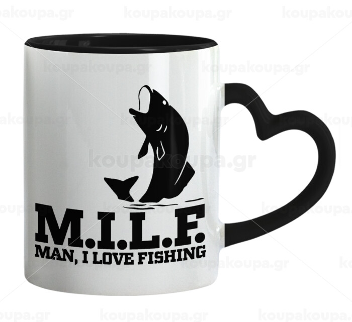 M.I.L.F. Mam i love fishing, Κούπα καρδιά χερούλι μαύρη, κεραμική, 330ml