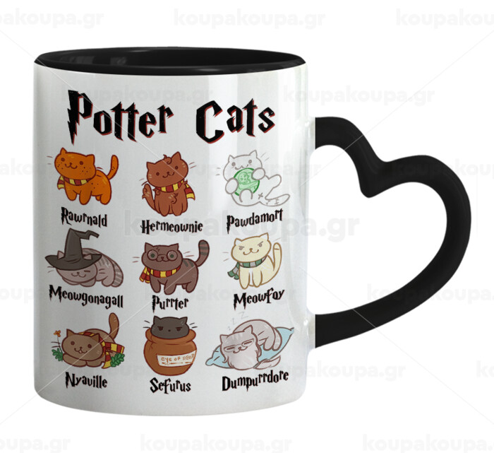Potter Cats, Κούπα καρδιά χερούλι μαύρη, κεραμική, 330ml