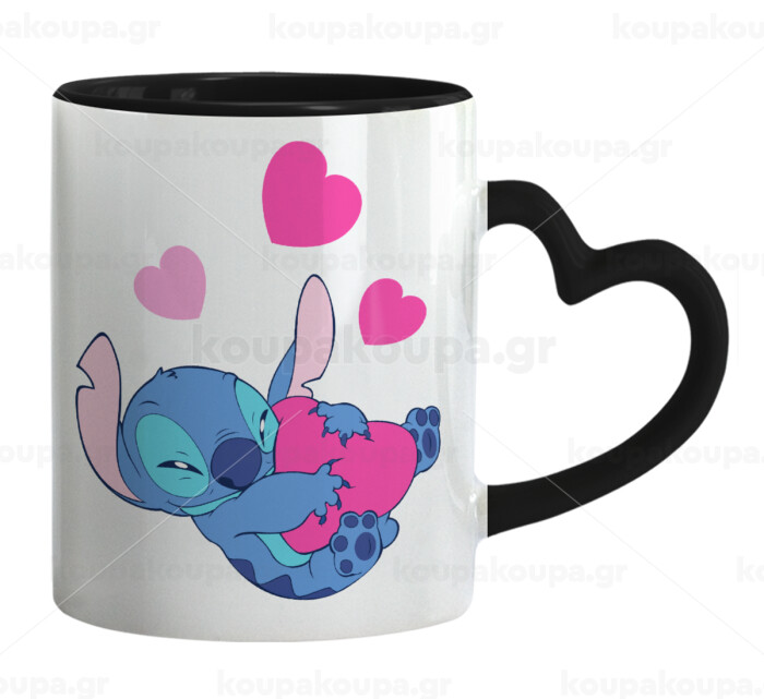 Lilo & Stitch hugs and hearts, Κούπα καρδιά χερούλι μαύρη, κεραμική, 330ml