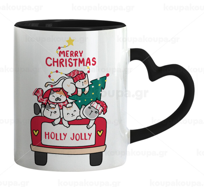 Merry Christmas cats in car, Κούπα καρδιά χερούλι μαύρη, κεραμική, 330ml