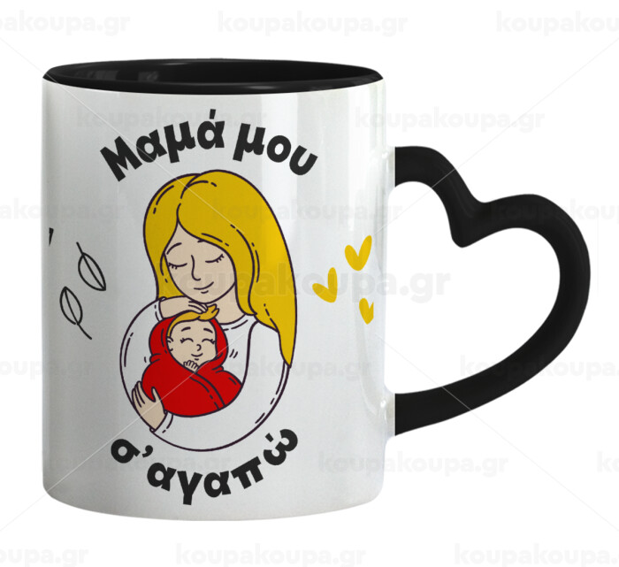 Μανούλα σ'αγαπώ αγκαλιά!, Κούπα καρδιά χερούλι μαύρη, κεραμική, 330ml