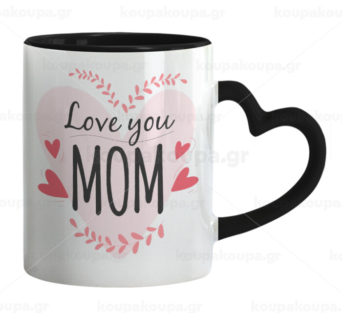 Mother's day I Love you Mom heart, Κούπα καρδιά χερούλι μαύρη, κεραμική, 330ml