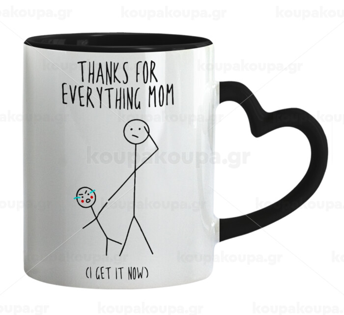 Thanks for everything mom, Κούπα καρδιά χερούλι μαύρη, κεραμική, 330ml