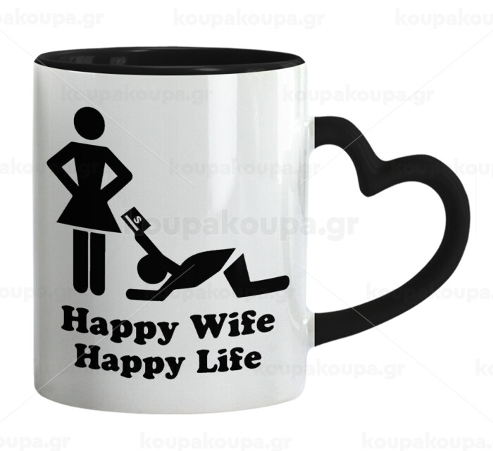 Happy Wife, Happy Life, Κούπα καρδιά χερούλι μαύρη, κεραμική, 330ml