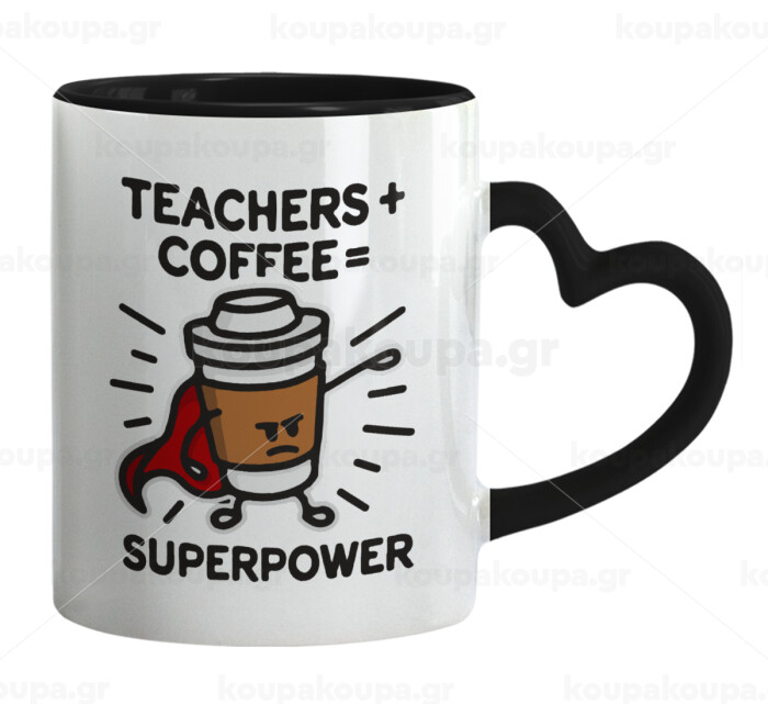 Teacher Coffee Super Power, Κούπα καρδιά χερούλι μαύρη, κεραμική, 330ml