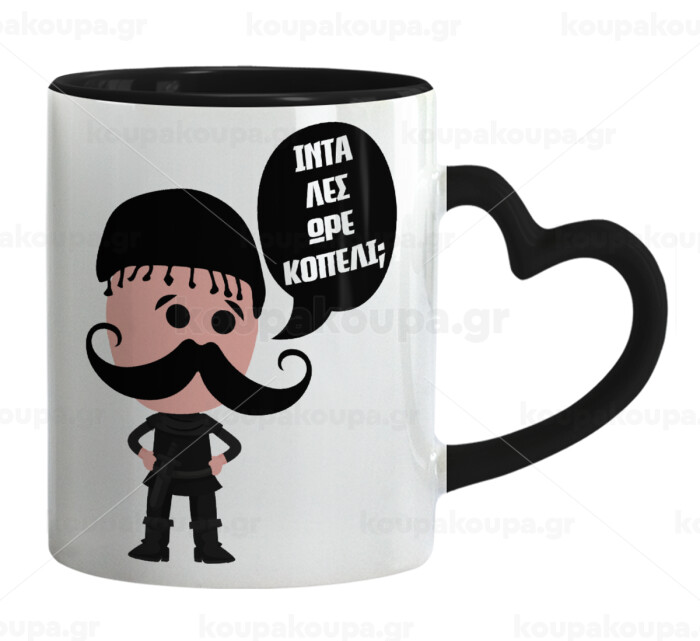 Κρητικός "Ίντα λες ωρέ κοπέλι", Κούπα καρδιά χερούλι μαύρη, κεραμική, 330ml