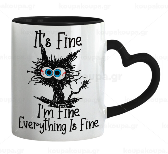Cat, It's Fine I'm Fine Everything Is Fine, Κούπα καρδιά χερούλι μαύρη, κεραμική, 330ml