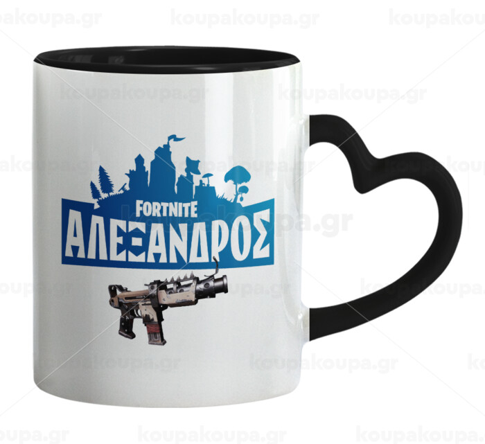 Fortnite with gun με το όνομα σου, Κούπα καρδιά χερούλι μαύρη, κεραμική, 330ml