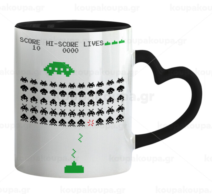 Space invaders, Κούπα καρδιά χερούλι μαύρη, κεραμική, 330ml
