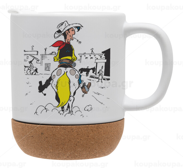 Λούκυ Λουκ comic, Κούπα, κεραμική με βάση φελού και καπάκι (ΜΑΤ), 330ml