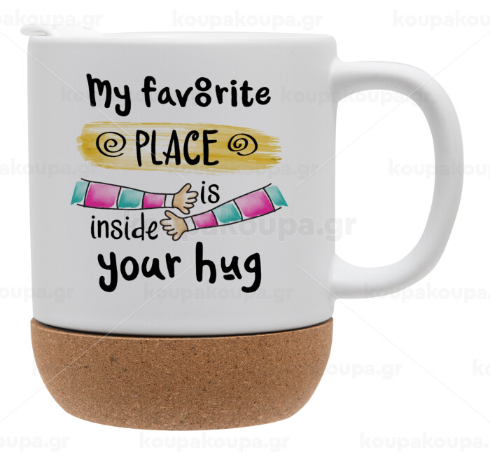 My favorite place is inside your HUG, Κούπα, κεραμική με βάση φελού και καπάκι (ΜΑΤ), 330ml