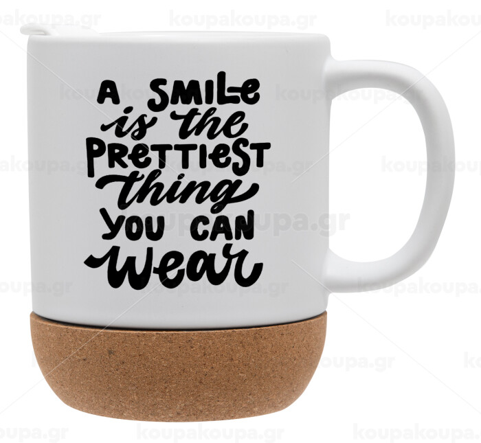A smile is the prettiest thing you can wear, Κούπα, κεραμική με βάση φελού και καπάκι (ΜΑΤ), 330ml