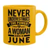 Never Underestimate the poer of a Woman born in..., Κούπα, κεραμική κίτρινη, 330ml