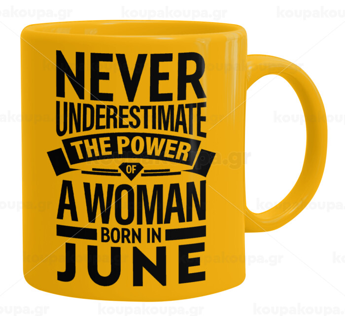 Never Underestimate the poer of a Woman born in..., Κούπα, κεραμική κίτρινη, 330ml